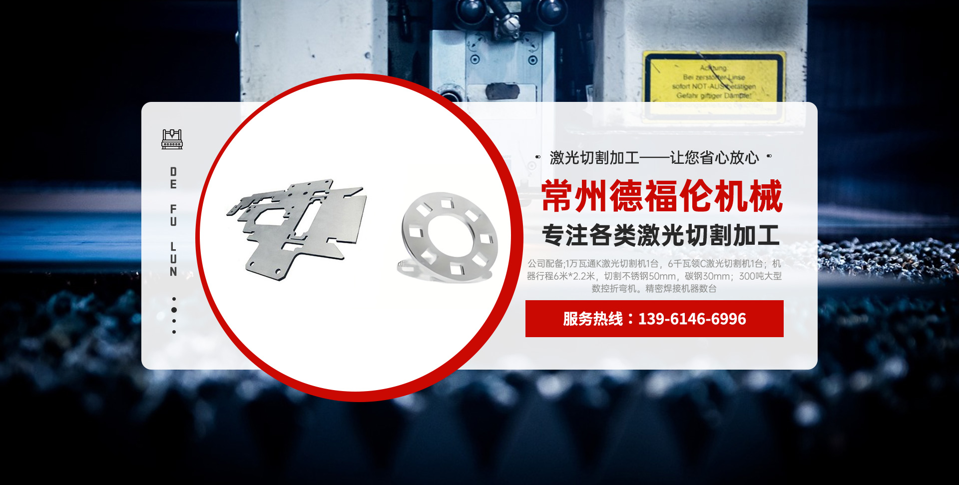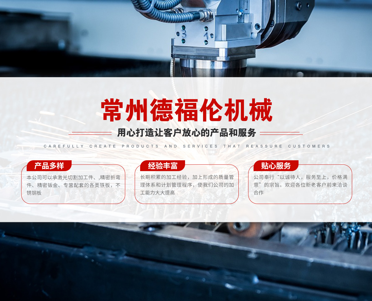 常州德福倫機械有限公司成立于2014年12月19號,位于江蘇省常州市武進區(qū)遙觀鎮(zhèn)建農(nóng)村劍童路56號西門;公司配備;1萬瓦通K激光切割機1臺,6千瓦領C激光切割機1臺;機器行程6米*2.2米,切割不銹鋼50mm,碳鋼30mm;300噸大型數(shù)控折彎機。精密焊接機器數(shù)臺。本公司可以承激光切割加工件、,精密折彎件、精密鈑金、專營配套的各類鐵板,不銹鋼板。長期積累的加工經(jīng)驗,加上形成的質(zhì)量管理體系和計劃管理程序,使我們公司的加工能力大大提高,滿足客戶所需,是我們公司的目標!公司奉行“以誠待人,服務為上,價格滿意”的宗旨。歡迎各位領導;老總前來洽談合作!